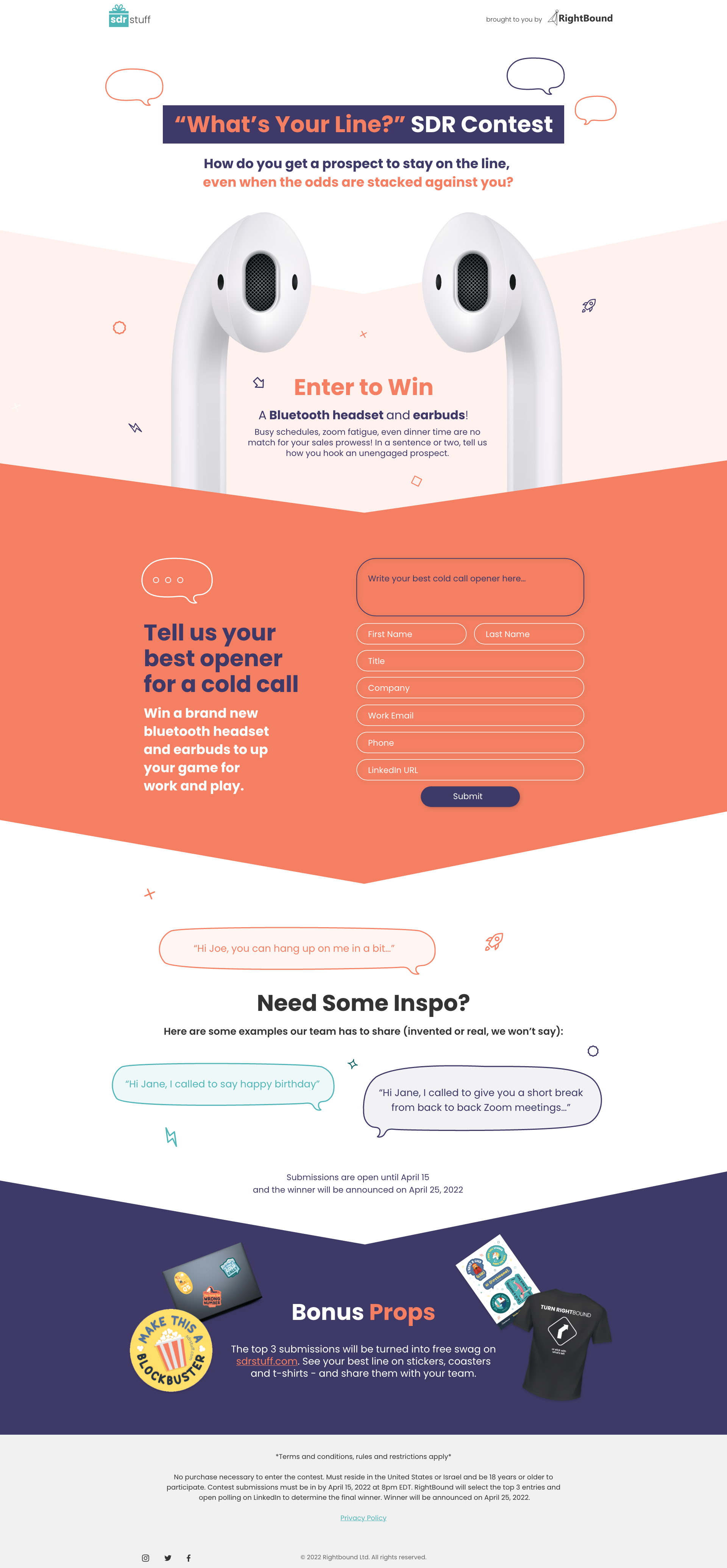 RightBound came to us with an ask to help promote and gain awareness of their brand and engage more on social media with their customers. They were specifically interested in running a sweepstakes contest, so I worked with our team or marketers and writers in creating social posts, and a landing page that their emails and posts would drive to in order to collect contact information for them, in an effort to then create more leads.